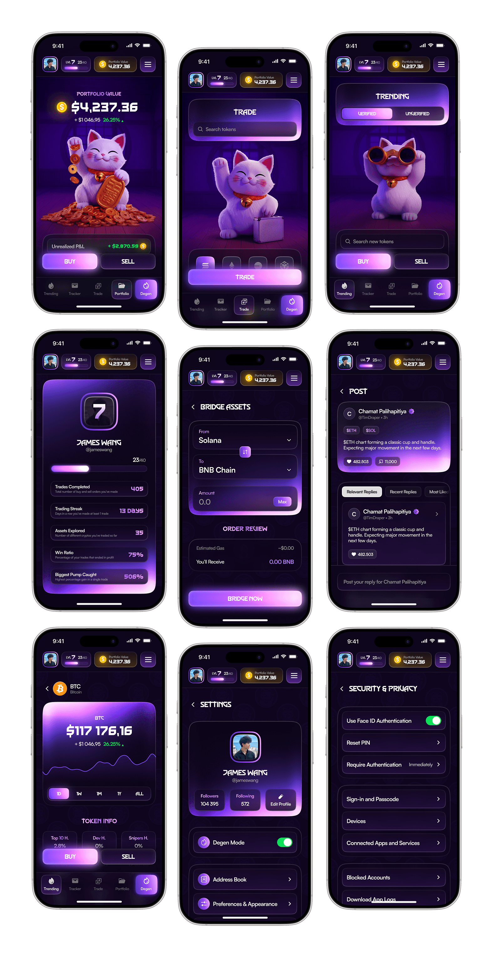The biggest challenge was making these two modes coexist without feeling like separate apps. The solution was to create two distinct but coherent visuals. Normal Mode uses blues, which communicates trust. Degen Mode flips the script with deep purples, vibrant magentas, and Maneki as the mascot.
